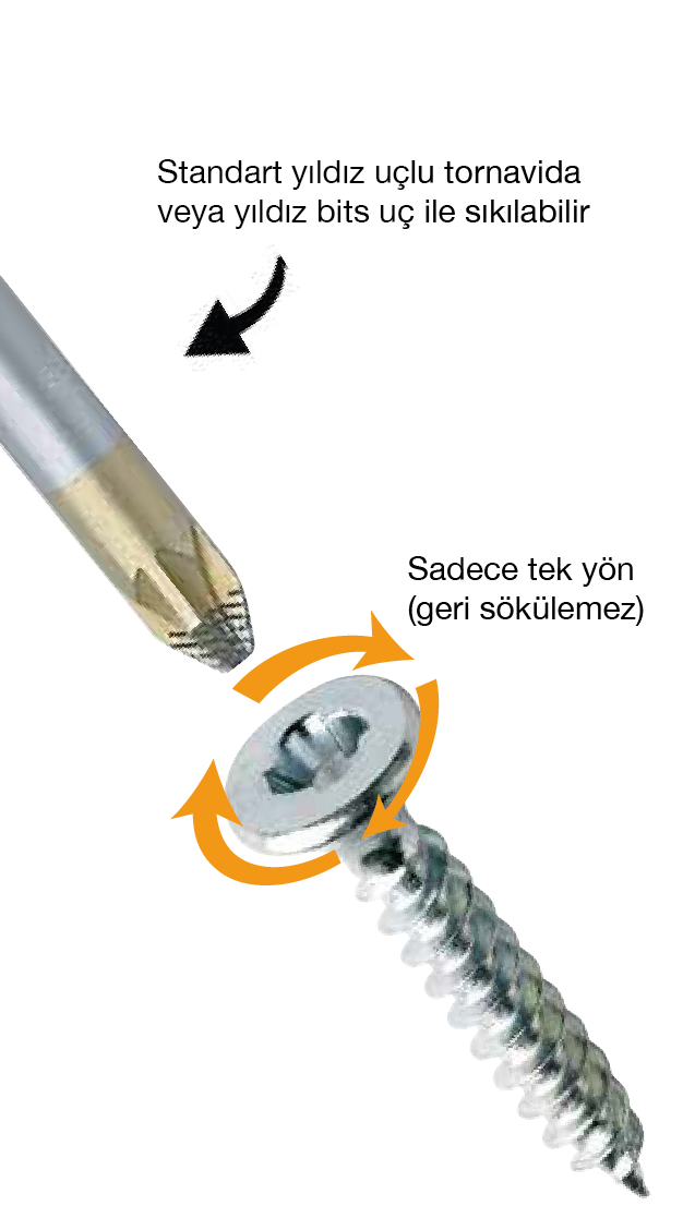 Benzersiz tek yönlü yıldız anahtarlı güvenlik vidası. Bu bağlantı elemanı sadece saat yönünde hareket ederek kalıcı bir bağlantı sağlar. Standart yıldız tornavidaları kullanarak kolay ve hızlı uygulanabilir. Sertleştirilmiş çelik çinkodan üretilmiştir.